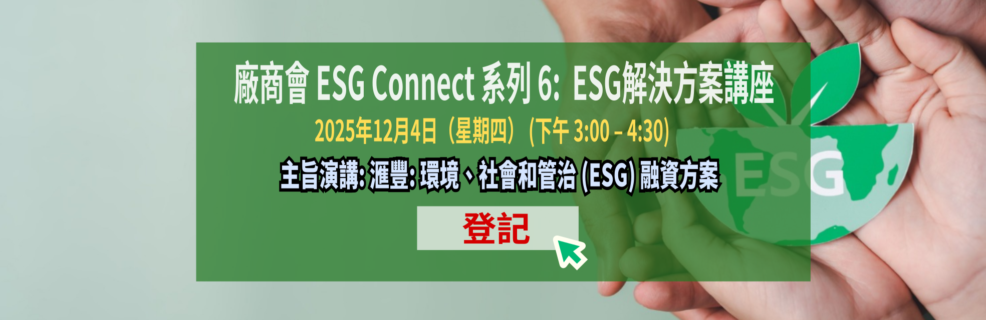 ESG Pledge Scheme is organized by The Chinese Manufacturers' Association of Hong Kong and co-operated with Hong Kong Brand Development Council. The scheme is aim at strengthening the concern of sustainable development. It encourages the business and public sectors to sign the pledge and implement the action plans to improve the ESG (Environmental, social and governance) performance, thus building a sustainable environment in future.